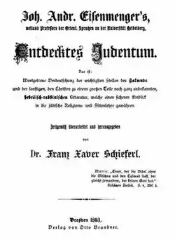 - ^ Hartmann, Anton Theodor (1834). Johann Andreas Eisenmenger und seine jüdischen Gegner. cited by Koch, Jens (1997). Johann Andreas Eisenmenger: sein Werk und dessen Wirkung (PDF) (in German). Projekt in der Herzog August Bibliothek Wolfenbüttel. p. 10.