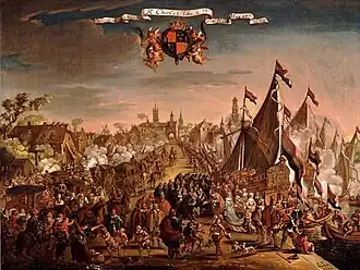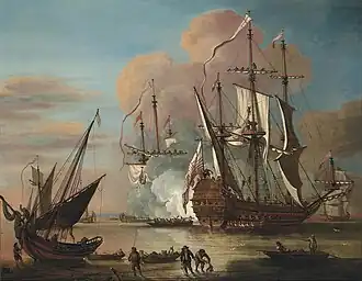 The National Maritime Museum in Greenwich has two paintings by Bouttats. The Shipping Scene in the Lower Thames, about 1720 depicts a river scene with a warship announcing its arrival by firing its guns amidst other ships including a Dutch flute (a merchant ship).[8] The painting entitled The Arrival of Charles II at The Hague, 15 May 1660 dated 1738 depicts the events leading to the Restoration of Charles II of England. It shows the process of disembarkation by Charles II when he arrived at The Hague and was greeted by courtiers. The painting was likely based on prints.[9]