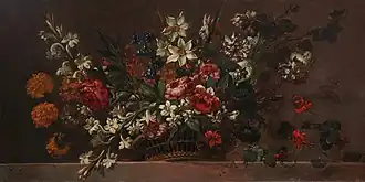 A few still lifes by him are known. A flower still life painting of Flowers in a porcelain bowl dated 1721 was sold at Bonhams. It represents flowers in a bowl placed on a stone plinth.[10] A similar painting dated 1728, which was an overdoor piece, was sold by Christie’s.[11] These still lifes are painted with a broad brush and less detail than the paintings in the National Maritime Museum.[2]