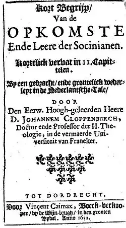 - Kort begrijp van der Leere der Socinianer (1630). A Dutch work against the Socinians, it appeared with a Dutch translation of a work of Fausto Sozzini, the De officio hominis Christiani.[17] It was later republished (Kort begrijp van de opkomste ende leere der Socinianen) as part of the Latin Compendiolum Socinianismi Confutatum (1652). It also included writings of the Polish Socinians Krzysztof Ostorodt and Andrzej Wojdowski, confiscated at the end of the 16th century.[18]