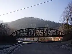Schwedler invented the Schwedler truss, which was widely used worldwide in framed bridges and roofs until about 1900. It is a kind of curved chord or bowstring truss with the minimum number of diagonals, which are to bear only tension, not compression; it requires a slight downward curvature in the middle, usually replaced with extra diagonal bracing for appearance and cost saving.[14][15] Schwedler himself would have preferred it to be used less on aesthetic grounds.[7] His first use of the innovation was for the railway bridge over the Weser at Corvey, on the edge of Höxter (1864),[7][16] for which he won a gold medal at the 1867 Paris International Exposition.[7][17] One of the last remaining examples is the bridge carrying the Nagold Valley Railway over the Nagold in Unterreichenbach.[18]