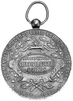 In the Colonies and Boer Republics which became the Union of South Africa in 1910, several unofficial military decorations and medals were instituted and awarded during the nineteenth and early twentieth century. The Johannesburg Vrijwilliger Corps Medal is an unofficial private campaign medal which was instituted in 1899 by Lieutenant Colonel S.H. van Diggelen, the founder and Commanding Officer of the Johannesburg Vrijwilliger Corps, for award to the officers and men of his unit.[1][2]