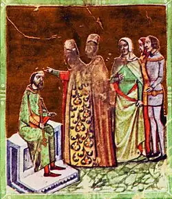 Archbishop Job died on 1 February 1204. Emeric, who intended to go on a pilgrimage to the Holy Land, did not want to leave his country in uncertainty. Having fallen seriously ill, Emeric wanted to ensure the succession of his four-year-old son, Ladislaus. However Job's successor, archbishop-elect Ugrin Csák died before the coronation. As a result, the event was performed by John of Kalocsa on 26 August 1204.[15] The dying king set his brother free and made him regent for the period of Ladislaus's minority. On 30 November 1204, King Emeric died, and Ladislaus III succeeded him. Pope Innocent sent a letter to Duke Andrew, warning him to respect the child king's interests. In April 1205, the pope sent a letter to John, who became de facto head of the Church in Hungary, and other prelates to support Ladislaus and his mother Queen Constance of Aragon. John was also commissioned to excommunicate the minor Ladislaus' enemies.[16] Considering her son's position to be insecure, Constance fled to Austria, taking Ladislaus with her.[17] The young king suddenly died there on 7 May 1205. Following that John crowned Andrew king in Székesfehérvár on 29 May 1205.[15]
