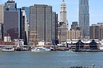 ![]() Piers 15, 16, and 17 (South Street Seaport) in New York City on the East River. Until the 21st century the John A. Lynch (ferryboat), on the NRHP since September 7, 1984 was docked at Pier 15, | |