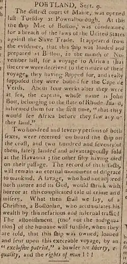 Boit's voyage would have violated the Slave Trade Act of 1794. Mac was seized and sold at auction in Bath, Maine in October 1799.[17]