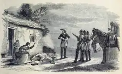 John Brown lived in a remote farm called Priesthill, in the upland parish of Muirkirk in Kyle, Ayrshire, where he cultivated a small piece of ground and acted as a carrier. Wodrow[4] describes him as 'of shining piety', and one who had 'great measures of solid digested knowledge, and had a singular talent of a most plain and affecting way of communicating his knowledge to others, he had employed his leisure in instructing youths.'[5] He had fought with the Covenanters at the battle of Bothwell Bridge (1679), and was on intimate terms with the leaders of the persecuted party. In 1682, Alexander Peden, one of the chief of these, married him to his second wife, Marion Weir. On this occasion Peden, according to Walker,[6] foretold the husband's early and violent end: 'Keep linen by you for his winding-sheet'.[7]