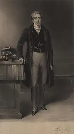 Francis was most successful as a figure and portrait painter. During his artistic career he completed a number of portraits of well known societal and political figures including Queen Victoria and Sir Robert Peel. Deffett's watercolour portrait of Queen Victoria (pictured on the right), displays the monarch with her dog, Dash, bounding by her side. The young monarch stands in a garden, elegantly attired in a bonnet and shawl. The painting was executed in 1837, the year that Queen Victoria assumed the throne, which may account for her youthful appearance. The painting was engraved and printed by Frederick Christian Lewis in 1838, a year after its original completion, and is still held in the Royal Collection.[6] Prints made after John Deffett Francis' figurative portrait paintings include: Madlle. Cerito: A Dancer (1858); Emma Romer, lithograph (n.d.); Fanny Cerito (1846); W.C. Macready (n.d.); Major General Sir William Nott, (1845); Captain Bowen Davies (1844) and Robert Peel (1841), and form part of the bequest made to the British Museum.[7]