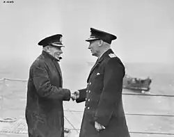 Dowding (left) shaking hands with Sir John Tovey in 1942, following his return from convoy QP 14