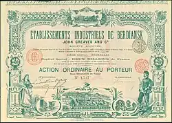 In 1883 he organised a small plant on Vorontsovskaya st. in Berdiansk.[4] In 1894 his plant was incorporated by Trade Industrial Association.[5] In 1896 at the All-Russian exhibition in Nizhny Novgorod J. Greave's plant was awarded the right to use the Russian Imperial Arms in its advertisements.[5] Two years later, Greaves was granted with personal gratitude from Nicolas II for "very energetic and fruitful activity in the field of Russian agricultural machines manifacturing'.[5] In 1899 he registered the company in Belgium as 'Belgian Anonymous Society John E. Greaves and Co' (Fr.: Etablissements industriels de Berdiansk John Greaves and Co, Société anonyme; Russian: Торгово-Промышленное Анонимное Общество "Джонъ Грiевз и Ко. Бердянск") to avoid Russian taxes. On 21 January 1900 it was officially established in Russia.[6] In 1912, Greaves became a Chavalier of the Belgian Order of the Crown.[7]