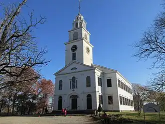 John Eliot Square's central landmark is the First Church of Roxbury, Boston's oldest surviving wooden meeting house from the Federal Period of American architecture.