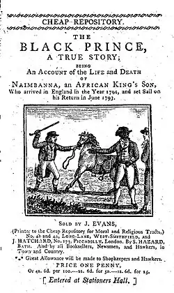 John Evans (1753–1820) was a London publisher who specialized in Street literature, popular prints, religious tracts, and children's literature. He also sold patent medicines in association with William Howard. John Evans was notable as one of the printers and publishers of the Cheap Repository Tracts 1797–1820. He was based in Long Lane, London where he printed The Black Prince an account of the life of John Naimbanna.