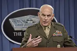 Kelly was the senior military assistant to the secretary of defense and personally greeted Secretary Leon Panetta at the entrance to the Pentagon on July 1, 2011, Panetta's first day as secretary.[23] Kelly was nominated for General on January 31, 2012, and confirmed by the U.S. Senate on July 26, 2012.[24] He succeeded General Douglas M. Fraser as commander of U.S. Southern Command on November 19, 2012.[1][25]