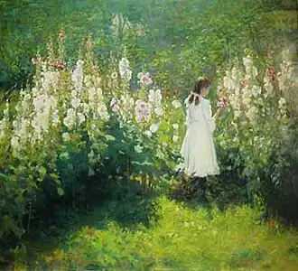 Weighed down by debt, Hafen asked for financial assistance from the LDS Church. He signed a contract with President Lorenzo Snow in 1901 to paint[2] a certain number of landscapes and portraits each month in return for $100.[4] Some of these portraits depicted LDS General Authorities[16] and were "accepted as being satisfactory" by the church.[2]: 24  With this support and income, Hafen was able to travel again. His lifelong friend John Fairbanks accompanied him to New York and Boston. Misfortune followed him east, and he again returned home without the recognition he sought.[2] Over the years, Hafen painted an estimated 200 works for the church,[24] including Girl Among the Hollyhocks, which has been commended as "a masterpiece of American Impressionism".[4]: 184