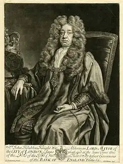 Sir John Houblon (13 March 1632 – 10 January 1712) was an English merchant and banker who served as the first governor of the Bank of England from 1694 to 1697. He also served as the Lord Mayor of London in 1695.