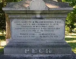 Returning to the U.S. after the war he served in the quartermasters department and against the Apache Indians on the frontier. Peck resigned from the army on March 1, 1853, and became the treasurer of a railroad project from New York to Syracuse, New York. In 1856 he stood as the Democratic candidate for Congress in the Onondaga district. At the time of Peck's reenlistment and appointment as brigadier general he held the position of cashier at the Burnett Bank of Syracuse of which he was one of the founding members.[1] Peck also served as president of the Syracuse board of education, which position he continued to hold while on active service and only resigned in 1862.