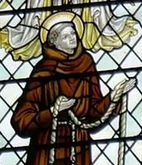 ![]() A detail from a stained glass depiction of Franciscan Saints above the high altar at the former Chilworth Friary of the Holy Ghost | |