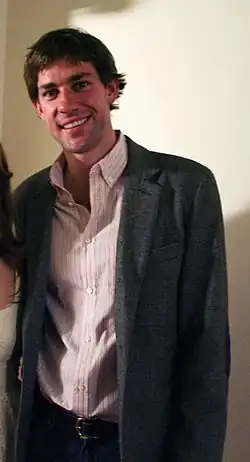 Krasinski's breakthrough came in 2004 when he was cast in the NBC sitcom The Office, a remake of the successful British TV series. In the series, a mockumentary about life at a mid-sized paper supply company, he played Jim Halpert, an intelligent and mild-mannered sales representative and, in later seasons, co-manager of the paper distribution company Dunder Mifflin in Scranton, Pennsylvania.[22] Krasinski and Jenna Fischer's characters were also the series' love interests.[23] To prepare for the role, Krasinski visited Scranton and interviewed employees at actual paper companies. He also shot the footage of Scranton used in the opening credits.[24] He appeared in every episode of the series and also directed several, including "Sabre". For his work in the series (2005–2013), he earned approximately $100,000 per episode of the third season of The Office, four times his salary for the previous two seasons.[25]