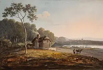 Laporte was born into a family of French Huguenot origins, possibly in London or in Ireland, and studied art under the Irish-born Huguenot painter John Melchior Barralet, either in London or Dublin.[1] He became a drawing-master at the Addiscombe Military Seminary, Surrey. He was also a successful private teacher, and Dr. Thomas Monro (the patron of J. M. W. Turner amongst others), was one of his pupils. From 1785 he contributed landscapes to the Royal Academy and British Institution exhibitions in London, and was an original member of the short-lived society called 'The Associated Artists in Watercolours,' from which he retired in 1811. He also painted in oils.[2]
