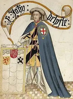 ![]() John de Lisle, 2nd Baron Lisle, KG, ninth founder knight of the Order of the Garter, shown wearing his garter robes over his tunic displaying the arms of Lisle of Rougemont. Illustration from the 1430 Bruges Garter Book made by William Bruges (1375–1450), first Garter King of Arms | |