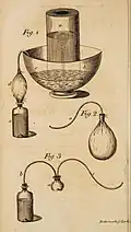 The instrument, which later came to be known as the Nooth apparatus, was based on one previously built by Joseph Priestley. Nooth argued that his device was superior because it was easier to use and, unlike Priestley's which used an animal bladder to contain the "fixed air", did not cause the water to taste of urine. Priestley took Nooth's criticism poorly at first;[4] in the second volume of his Experiments and Observations on Different Kinds of Air, he retorted that "when the Doctor shall once more produce this urinous flavour [...] taking care that no careless servant shall have mixed any urine in the water he calls for, I shall give this new objection to my process a farther examination. At present I am inclined to consider this as an experiment of the servant, rather than of the Doctor himself."[6] However, he would eventually come to recommend Nooth's apparatus over his own.[4]