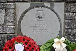On 12/13 September 1917 north of Broenbeek, Belgium, Lance-Sergeant Moyney was in command of 15 men forming two advanced posts. Surrounded by the enemy he held his post for 96 hours, having no water and very little food. On the fifth day, on the enemy advancing to dislodge him, he attacked them with bombs, while also using his Lewis gun with great effect. Finding himself surrounded, he led his men in a charge through the enemy and reached a stream, where he and a private (Thomas Woodcock) covered his party while they crossed unscathed, before crossing themselves under a shower of bullets.[1]