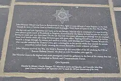 Facing plaque on the memorial to John Moyney, V.C, on Mill Road, Rathdowney, co. Laois.