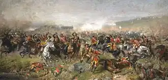 John Mulvany (c. 1839–1906) was an Irish born American artist best known as an artist of the American West[1] who painted the first large (11 ft x 21 ft) image of General Custer’s defeat by the Oglala Sioux Indians at Little Big Horn in 1876. Mulvany's painting Custer’s Last Rally, was finished in 1881.[2] In Ireland, he is known for The Battle of Aughrim, painted in 1885[3] and exhibited in Dublin in 2010.[4]