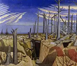 In 1914 Nash began painting in oils with the encouragement of Harold Gilman, whose meticulous craftsmanship influenced his finest landscapes. Nash's most famous painting is Over the Top (oil on canvas, 79.4 x 107.3 cm), now hanging in the Imperial War Museum. It is an image of the counter-attack at Welsh Ridge on 30 December 1917, during which the 1st Battalion Artists' Rifles left their trenches and pushed towards Marcoing near Cambrai. Of the eighty men, sixty-eight were killed or wounded during the first few minutes. Nash was one of the twelve spared by the shell-fire, and painted this picture three months later.[2] The Cornfield, held by the Tate Gallery, was the first painting Nash completed that did not depict the theme of war. The picture with its ordered view of the landscape and geometric treatment of the corn stooks prefigures his brother Paul's Equivalents for the Megaliths. Nash said that he and Paul used to paint for their own pleasure only after six o'clock, when their work as war artists was over for the day; hence the long shadows cast by the evening sun across the middle of the painting.