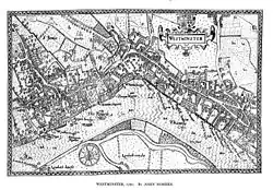 Norden's maps of London and Westminster (in his Speculum Britanniae of 1593) are the best representations known of the English metropolis under the Tudors; his maps of Middlesex (also from the Speculum Britanniae of 1593), of Essex (1594), of Hertfordshire (1598) and of Cornwall (published in 1728; see above) are also notable. In the last of these the roads are indicated for the first time in English cartography.[1]