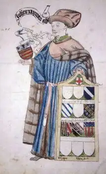 John Norman's coat of arms appear illustrated in the portrait (pictured right) painted by Roger Leigh who lived around 1450.[1] They (pictured above left) are recorded in British Library Harley MS 2169, folio 65; and are blazoned: Or, three bendlets gules, a chief per fess argent and ermine, charged in chief with three fleurs de lys sable.[9] In the mid 19th century, Burke however gave a different blazon which omits the ermine: Or, three bars gules on a chief argent as many fleurs de lis sable.[13]