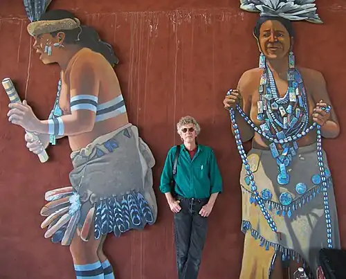 Since 2000, Wehrle has worked steadily on public art projects, primarily on the West Coast of the United States. He has been creating murals and gateways for the cities of Richmond, Hayward, Dublin, and Pinole,[12] alongside interior installations for Ocean View Library, Encino Fire Station #83 and other California locations. He received a grant from the Maxwell H. Gluck Foundation to create a series of nine murals depicting important scientific discoveries and contributions to the fine arts of alumnae of the University of California, Riverside.[13][14] In 2007 he produced Neptune’s Ghost, a time blended painting of historic Neptune Beach and present day shoppers in Alameda, California, (which was removed as of 2018). Other works include Mak Roote, a landmark installation for Berkeley Transit Plaza.[15] Featuring poetic words by Betsy Davids and images by Wehrle that include native Ohlone, union railroad porters, writer Chiori Santiago and humanitarian clown Wavy Gravy, the work was given an award by the city of Berkeley.[16][17] Recent works include installations in public schools for Washington State Arts Commission,[15] murals for Richmond's City Council Chambers and the newly restored Richmond Plunge.[15]