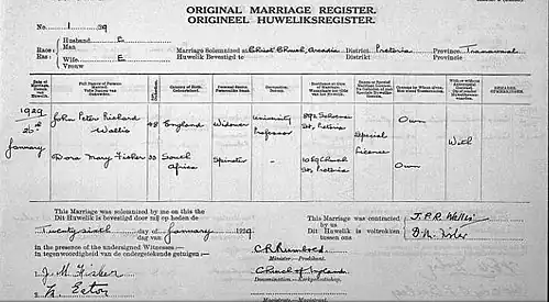 Wallis was married to Dora Mary Fisher, a 33-year-old spinster, on 26 January 1929 at Christ Church, Arcadia in Pretoria by the Dean of the Church of England in Pretoria, the Very Rev. C.R. Rumbold. Wallis was recorded as being a widower living at 892 Schoeman St, Pretoria.