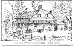Upon his arrival in York he was in possession of a male slave whom he had bought in Antigua for £144.[1][4][5] While slavery did persist in Upper Canada into the 1830s, by 1809 the abolition movement was well underway. In 1793 the Upper Canada legislature had passed the Act Against Slavery which among other things outlawed the importation of slaves and, in 1807, Britain had enacted the Slave Trade Act which abolished the slave trade in the British Empire. Scarlett's first house in the area was a large structure of hewn logs near the river but it was destroyed in a fire.[2][6][7] He then lived about six miles west of York at Simcoe Grange, a house that stood near what is now the intersection of Keele Street and Dundas Street.[8]