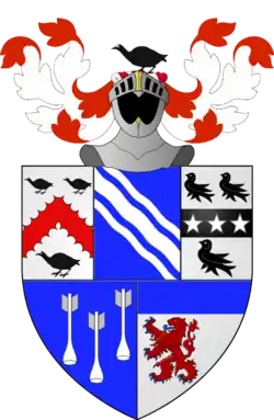 Quarterly of Five. -1. Argent, a chevron engrailed gules between three black coots sable. (Southcote) 2. Azure, a bend wavy between two bundles argent. (Keynes) 3. Argent, on a fess sable with three mullets or, between three markets sable. (Pury) 4. Azure, thee bird-bolts argent. (Bozome) 5. Argent, a lion rampant gules, a chief azure. (St. George)