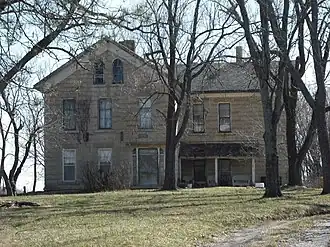 In 1856 pro-slavery Missourians burned down Jones's house, and burned the next one as well. In 1862 he started to build a third house on the same site, a large stone structure that is now known as the Tauy Jones House. He hired Damon Higbie of LeLoup.[7][8]