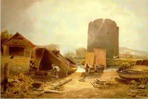 - ^ This faded watercolour depicts one of Norwich's two medieval boom towers across the River Wensum, possibly made c.1809. Thirtle painted the tower on five different occasions.[60]