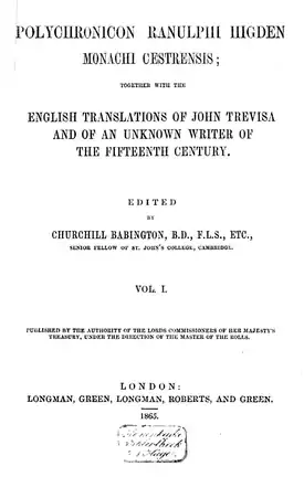 2. ^ "Polychronicon Ranulphi Higden, Monachi Cestrensis; together with the English translation of John Trevisa, and of an unknown Writer of the Fifteenth Century edited by Rev. Joseph Rawson Lumby, Vol. III". The Athenaeum (2282): 108–109. 22 July 1871.