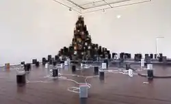 Wynne is best known for his series of installations involving large accumulations of cast-off speakers, beginning with Fallender ton für 207 lautsprecher boxen (Falling tone for 207 loudspeakers) in Berlin in 2004.[2][3] In 2009, his Installation for 300 speakers, player piano and vacuum cleaner at the Beaconsfield Gallery in London was the first piece of sound art purchased by the Saatchi collection.[4][5] Wynne won the 2010 British Composer Award for Sonic Art for this piece, and when it was shown at the Saatchi Gallery in 2010 as part of Newspeak, Adrian Searle wrote in The Guardian that:
