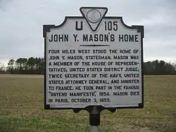 John Young Mason (April 18, 1799 – October 3, 1859) was an attorney, planter, judge and politician from Virginia. Mason served in the U.S. House of Representatives after serving in both houses of the Virginia General Assembly, then became the United States district judge for the United States District Court for the Eastern District of Virginia (1841-1843), but resigned that position to hold important executive and diplomatic offices in the administrations of Presidents John Tyler, James K. Polk, Franklin Pierce and James Buchanan before his death in Paris, France shortly before the American Civil War, including as the 16th and 18th United States Secretary of the Navy, the 18th Attorney General of the United States and United States Minister to France.[1][2][3]