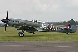 Johnson's wartime record was 515 sorties flown, 34 aircraft claimed destroyed with a further seven shared destroyed (three and one shared victories), three probable destroyed, 10 damaged, and one shared, destroyed on the ground.[9] All his victories were fighters. As a wing leader, Johnson was able to use his initials "JE-J" in place of squadron code letters. He scored the bulk of his victories flying two Mk IXs: EN398/JEJ in which he shot down 12 aircraft and shared five plus six and one shared damaged, while commanding the Kenley Wing; MK392/JEJ, an L.F Mk. IX, 12 aircraft plus one shared, destroyed on the ground. His last victory of the war was scored in this aircraft. Johnson ended the war flying a Mk XIVE, MV268/JEJ.[89] His post-war mount was MV257/JEJ; it was the last Spitfire to carry his initials.[90]