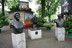 The square was named for a popular musician in the mid-1900s: Johnny Jordaan which was the stage name of Johannes Hendricus van Musscher. There is a colorful hut in the small square and bronze sculptures of Jordaan musical hall of fame.[1] The English name for the square is "Johnny Jordaan Square".[2] Jordaan died in 1989 and shortly after his death there were proposals to dedicate the square. A statue of Johnny Jordaan was unveiled in 1991. There are sculptures of other performers: Tante Leen, Johnny Meijer, Manke Nelis and Jan & Mien in the square.[3]