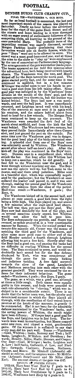 The Wanderers even finished the season with silverware, winning the Dundee Burns Club Charity Cup - a competition for the senior clubs in Dundee - by beating Harp, who had won the competition for the previous three seasons. 4,000 people (paying a gate of £27) watched the 9–1 win over East End in the semi-final,[9] Over twice that number watched the final at West Craigie Park, which Wanderers won 4–1 after a "splendid game".[10]