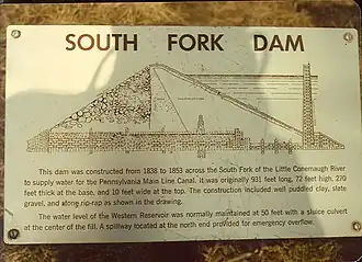 High above the city, the Commonwealth of Pennsylvania built the South Fork Dam between 1838 and 1853 as part of a cross-state canal system, the Main Line of Public Works. Johnstown was the eastern terminus of the Western Division Canal, supplied with water by Lake Conemaugh, the reservoir behind the dam.