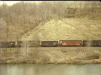 The village of East Conemaugh was the next populated area to fall victim to the flood. One witness on high ground near the town described the water as almost obscured by debris, resembling "a huge hill rolling over and over".[15] From his idle locomotive in the town's railyard, engineer John Hess heard and felt the rumbling of the approaching flood. Throwing his locomotive into reverse, he raced backward toward East Conemaugh, the whistle blowing constantly. His warning saved many people who reached high ground. When the flood hit, it picked up the still-moving locomotive off the tracks and floated it aside; Hess himself survived, but at least fifty people died, including about twenty-five passengers stranded on trains in the village.