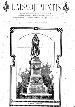 In 1909, Šliūpas published the last third volume of the history of Lithuania that covered the period from the Union of Lublin (1569) to the Third Partition of the Polish–Lithuanian Commonwealth (1795).[126] In January 1910, he began publishing the monthly magazine Laisvoji mintis (Free Thought) with the help of two new Lithuanian immigrants with prior experience in publishing periodicals in Scranton – Karolis Račkauskas (pen name Vairas) and Kleopas Jurgelionis (pen name Kalėdų Kaukės).[127] The magazine promoted the ideas of freethought and was primarily devoted to science. It published many articles on natural sciences, many of them translated (e.g. A Picture Book of Evolution by Dennis Hird or on popular astronomy by Garrett P. Serviss).[128] Šliūpas contributed biographical articles (e.g. on Giordano Bruno, Lucilio Vanini, Jan Hus, Francisco Ferrer) and articles on the 19th-century history of Lithuania (written as a continuation to his three-volume history of Lithuania).[129] The magazine was discontinued after 60 issues in May 1915. Šliūpas resigned as editor in December 1914 citing his age and poor eyesight. Privately, he mentioned to Račkauskas that he spent more than $5,000 (equivalent to $157,000 in 2024) of his own money on the magazine.[130]