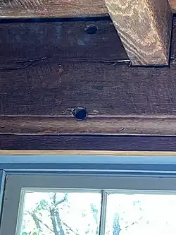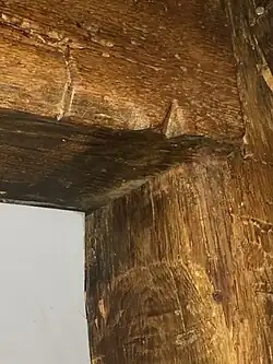 East chimney girt with larks's tongue stop and notch, joining the rear chimney post. All original framing members retain traces of whitewash beneath later lath and plaster evidence.