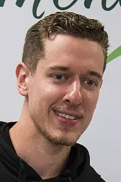 Jordan Binnington (born July 11, 1993) is a Canadian professional ice hockey goaltender for the St. Louis Blues of the National Hockey League (NHL). Binnington was raised in Richmond Hill and Toronto, Ontario.[1] He played major junior hockey for the Owen Sound Attack of the Ontario Hockey League, winning the Hap Emms Memorial Trophy as best goaltender of the 2011 Memorial Cup and the 2013 Jim Rutherford Trophy as the OHL goaltender of the year. He was selected by the Blues in the third round, 88th overall, of the 2011 NHL entry draft. Binnington played for Canada in the 2013 IIHF World U20 Championship.[2] He spent seven seasons in the minor leagues, with a brief call-up to the NHL in 2014 as an emergency goaltender before making his NHL on-ice debut in 2016. In December 2018, he was called up by the Blues and within a month became their starting goaltender. His play helped the team improve from last place in the league to winning the 2019 Stanley Cup championship. He is the first NHL rookie goaltender to earn 16 wins in a single postseason, the maximum amount possible (not including the 2020 postseason, which included play-in games that enabled a goaltender to record more than 16 wins). He is the all-time wins leader for two franchises, the St. Louis Blues and the Owen Sound Attack.