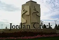 Jordan Creek Town Center is a shopping mall in the city of West Des Moines, Iowa. It is the largest shopping complex in the state of Iowa with a total gross leasable area of 1,340,000 square feet (124,000 m2).[2] It is also the fourth largest shopping complex in the Midwest, and the 24th largest shopping complex in the United States. The center is named after Jordan Creek, a tributary of the Raccoon River that was named after James Cunningham Jordan, the first person to settle in what is now West Des Moines.[3] The mall's anchor stores are Century Theatres, Dillard's, Von Maur, and Scheels All Sports and includes the only Apple Store in Iowa.