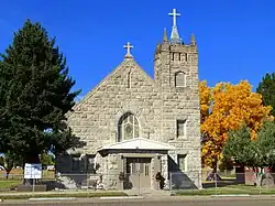 Many Basque immigrants came to Jordan Valley, starting around 1889 with the arrival of José Navarro and Antone Azcuenaga. Local oral history claims that before long, the Basques comprised around two thirds of the population of the town.[11] A pelota court, known as the Pelota Fronton, was built in 1915, and still stands as a historic landmark.[12] The Basques also constructed several sandstone buildings, including three boarding houses,[13] and (with the help of local Irish immigrants) the St. Bernard's Catholic Church, which can still be seen today.[14] Basque immigration to the area slowed with the passing of the Taylor Grazing Act of 1934, which favored cattle ranching over sheep, the Basques' preferred livestock.[6] To this day, a majority of the town's population identify as being of Basque Heritage.