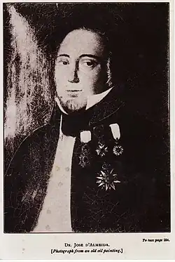 In 1808, d'Almeida was appointed the senior surgeon of the Vasco da Gama, a battleship which was stationed in Lisbon. He then travelled to the East and became the director of the Saint Raphael's Hospital in Macau. While passing by in Singapore, he gave Francis James Bernard money to build a house on Beach Road.[1][2]